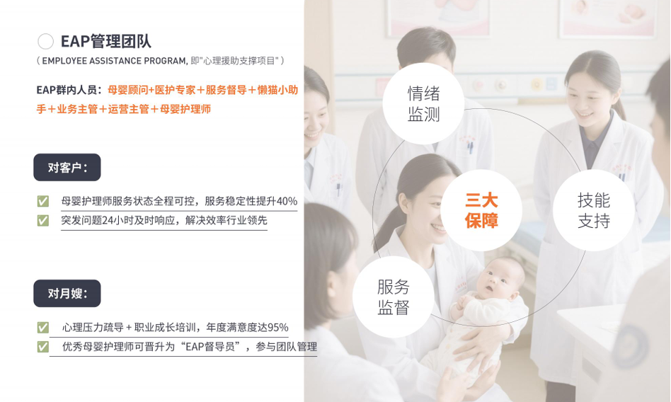 EAP 体系不仅为月嫂等从业者提供专业的心理疏导与职业支持,帮助其缓解工作压力、提升职业幸福感,更能通过从业者的良好状态,为客户提供更有温度、更专业的服务,让客户更安心。