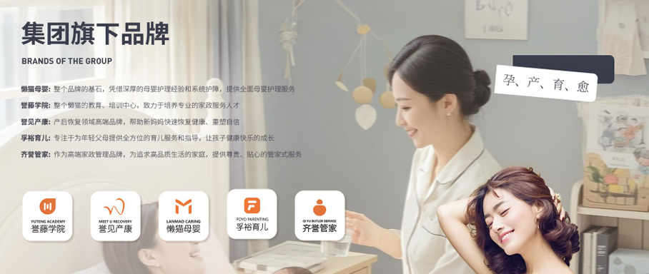 以 “一切以客户为中心” 为核心价值观,布局上海总部及合肥、重庆、苏州、杭州、青岛、成都七大城市,旗下懒猫母婴、孚裕育儿、誉藤学院、誉见产康等多品牌协同发展,形成 “专业月子护理 + 母婴技能培训” 的一体化经营模式,始终致力于 “为每个家庭构筑美好生活”。